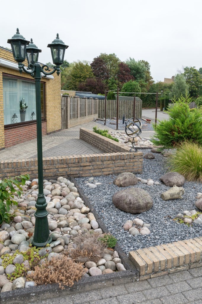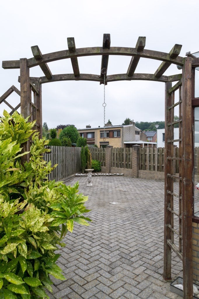 Ruime tuin achter en naast de woning, geheel betegeld (klinkers en uitgewassen tegels) onderhoudsarm. Gemetselde penanten met houten tuinschotten. Via tuindeur is achterom bereikbaar. Eenvoudig tuinhuis. Buitenkraan.