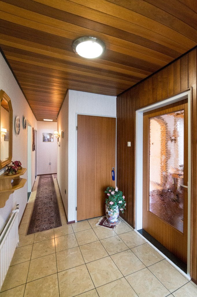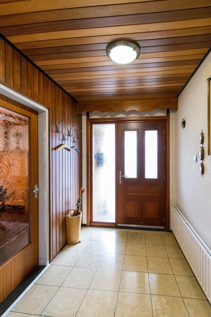 Entree, ontvangsthal (650×184/86) met plavuizen vloer. Meterkast met vier groepen, aardlekschakelaar en slimme meters (gas/electra). Toilet met fonteintje.